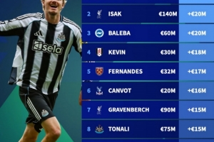 英超身价涨幅榜:沃尔特马德+3500万欧居首,伊萨克+2000万欧次席