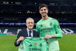 库尔图瓦达成皇马生涯出战300场里程碑,俱乐部主席弗洛伦蒂诺向他颁发了纪念球衣。
