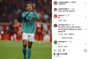 赛后,红军队长范迪克更新社交媒体晒照配文鼓励球队,写道:让我们继续共同努力!