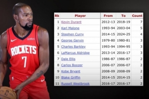 杜兰特在休斯敦对阵火箭季后赛​共砍下7次​30+,为历史最多(共7场)。